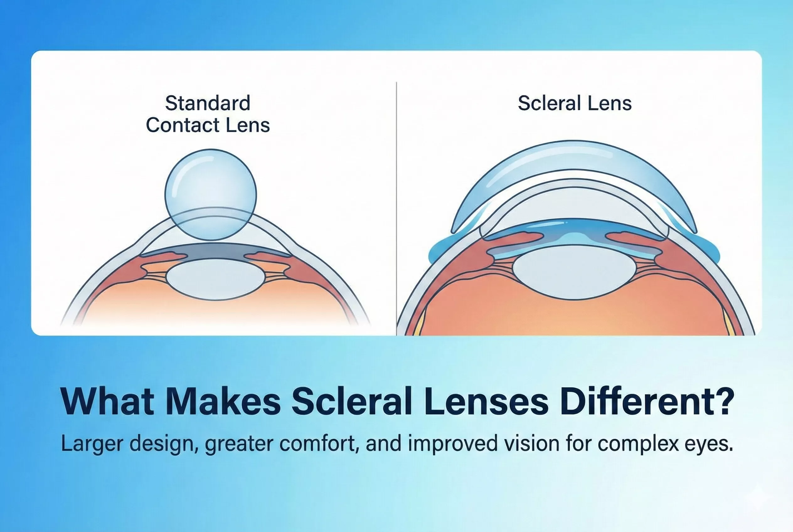 This makes scleral lenses an excellent option for conditions like keratoconus, corneal scarring, and post-surgical vision changes.